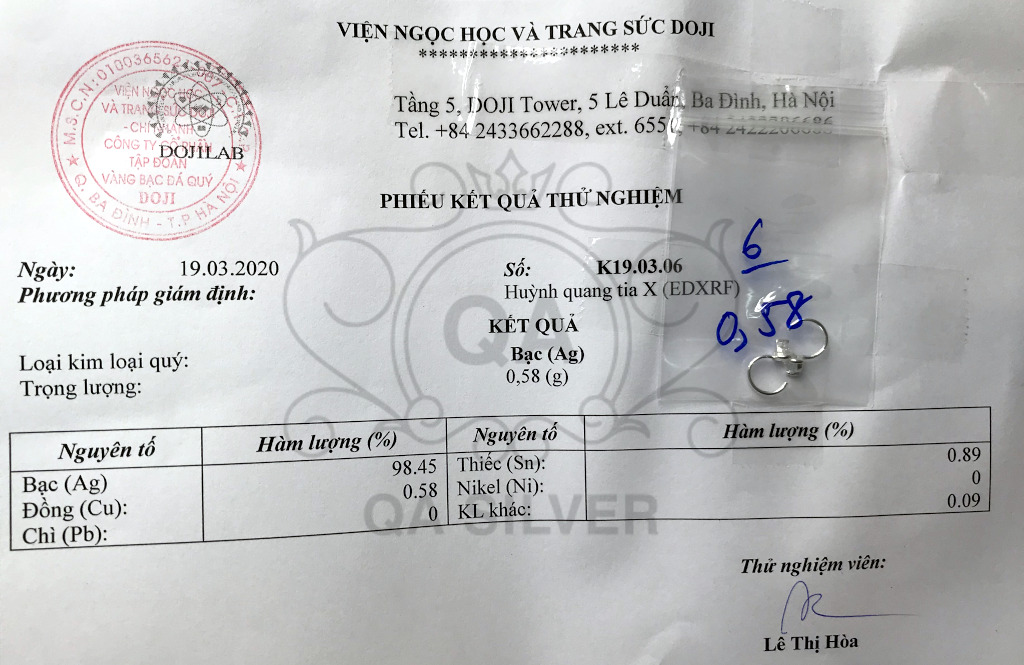Thành phần: 98.45% bạc, 0.58 % đồng, 0.89% thiếc (khách xem chi tiết tại ẢNH GIÁM ĐỊNH SẢN PHẨM BẠC – Ảnh 2). Sản phẩm đã được test mẫu tại Trung tâm giám định, đảm bảo chuẩn chất lượng.